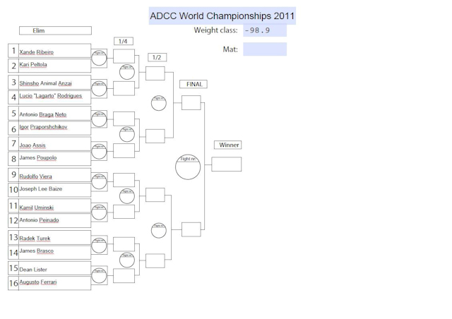 Até 99kg: Depois de estréias teoricamente mais tranquilas, se vencerem, Xande Ribeiro e Lúcio Lagarto ficarão frente à frente em uma das quartas de final. O mesmo acontece com Braga Neto e João Assis. Na parte de baixo, Rodolfo Vieira estréia no ADCC contra Joseph Lee Baize e, se vencer, deve ter Antônio Peinado pela frente. Radek Turek, James Brasco, Dean Lister e Augusto Ferrari fazem a uma guerra sem favoritos por uma vaga nas semifinais. Final dos sonhos (de quem)? Xande x Rodolfo.