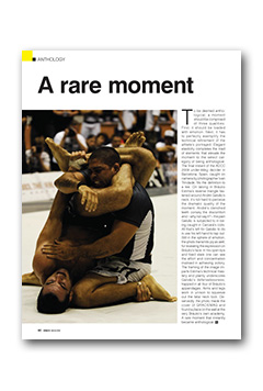 And if you, dear reader, are after tricks, lessons and helpful tips to get you out of a plateau, you can’t go wrong with part two of the report on the 15 most winning athletes in the saga of the World Championship. This month, Marcelo Garcia deciphers Fabio Gurgel, Roger Gracie puts Marcio Feitosa under the microscope, Rodrigo Comprido offers his take on Robson Moura’s style, and Barral’s game gets a close look from Feitosa, and much more. There’s gem after gem, in an article collectors will relish.
