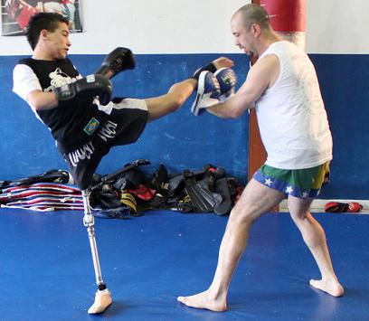 Team founder Edinei Pedroso teaches muay thai to everyone, regardless of the student’s level or objectives and nearly three months ago a very special student, Eric Santos, began attending class. This young man has a genetic problem and was born with a femur and his tibia is linked directly to his hip, and thus had to be amputated at birth.