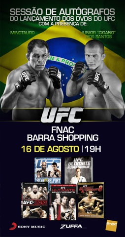 Estrelas brasileiras do UFC, os atletas Rodrigo Minotauro e Júnior Cigano estarão nesta terça-feira, dia 16, às 19h na Livraria FNAC do BarraShopping, para o lançamento oficial dos DVDs do maior evento de MMA do mundo, o UFC. Inicialmente a Sony Music em parceria com o UFC lança 5 volumes com o melhor das lutas do evento – com destaque para os DVDs “Ultimate Knockouts 8”, “Ultimate Heavyweights” e o duplo “The Best of 2010”, em que tanto Cigano quanto Minotauro aparecem em destaque.