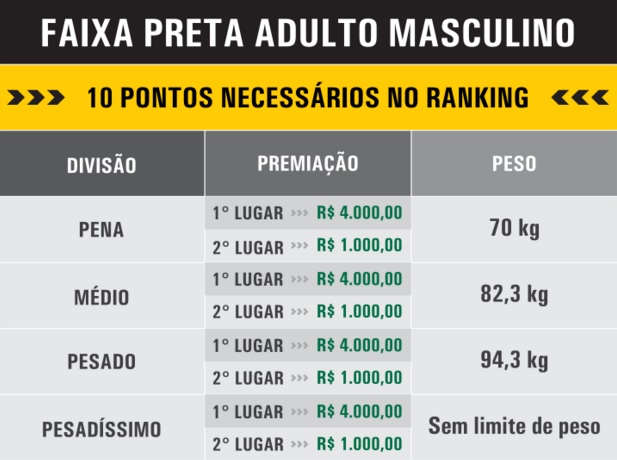 Para o atleta faixa-preta adulto se credenciar à disputa dos prêmios, é necessário que o mesmo possua, no mínimo, 10 pontos no ranking da IBJJF. Serão quatro divisões de peso, no qual o vencedor leva 4 mil reais, e o segundo 2 mil reais. As chaves serão montadas para que atletas da mesma academia se encontrem até a semifinal, e os tradicionais “fechamentos” de peso não serão permitidos. Outro detalhes é que não haverá disputa de absoluto no faixa-preta adulto.