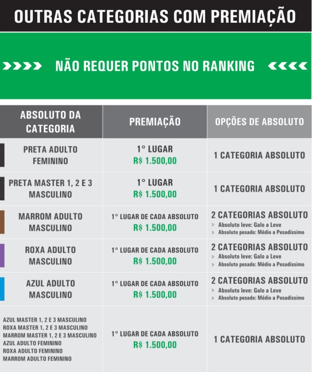Nas demais categorias com premiação, não existe o requisito mínimo de pontuação no ranking. Os prêmios vão apenas para as disputas de absoluto, com valores de 1.500 reais para cada vencedor. Para estar apto a disputar o absoluto, o atleta precisa ter conquistado o pódio em sua respectiva categoria de peso (1°, 2° ou 3° lugar).