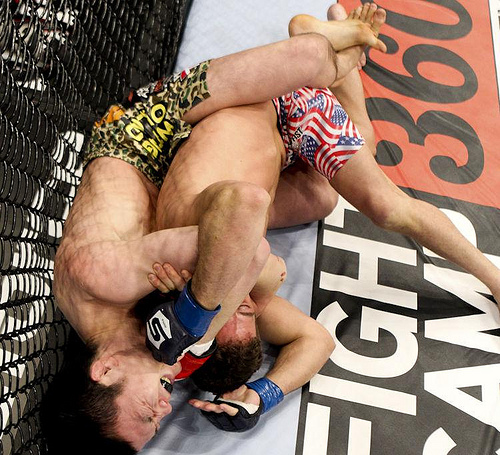 Shinya Aoki taps out Lyle Beerbohm at 2011 Strikeforce event. (Photo by Esther Lin)