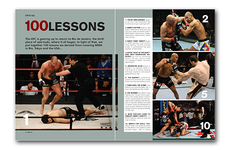 Now if you’re already an escape master and aren’t worried about your windpipe, no problem. This month’s issue has something for everybody. In CHOKE, we serve up 100 lessons we learned from covering MMA over the years. This memorable (and fun – for us as too) article is also on the menu.